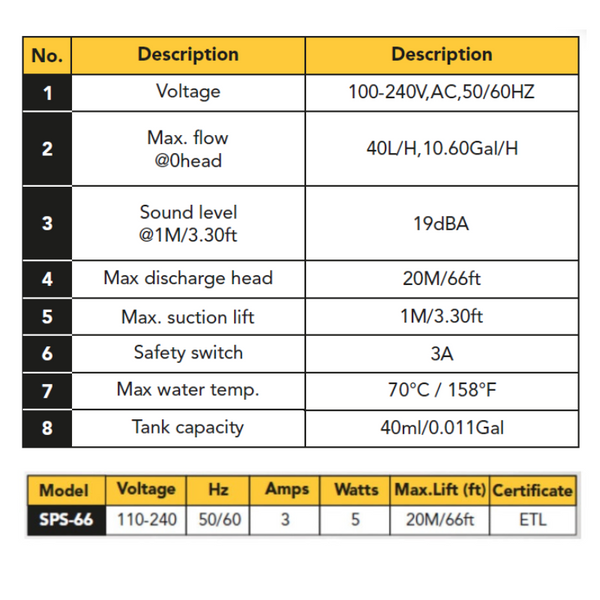The SPS Series Mini Split Condensate Pump is designed to remove condensate water efficiently from mini-split HVAC systems. It features thermally protected operation, overflow alarm to prevent water damage, automatic tank cleaning, error alarm, and an anti-mold tank for long-lasting performance. Suitable for water temperatures 0–70°C (158°F), and ETL certified for safe installation.